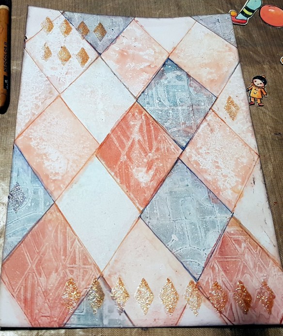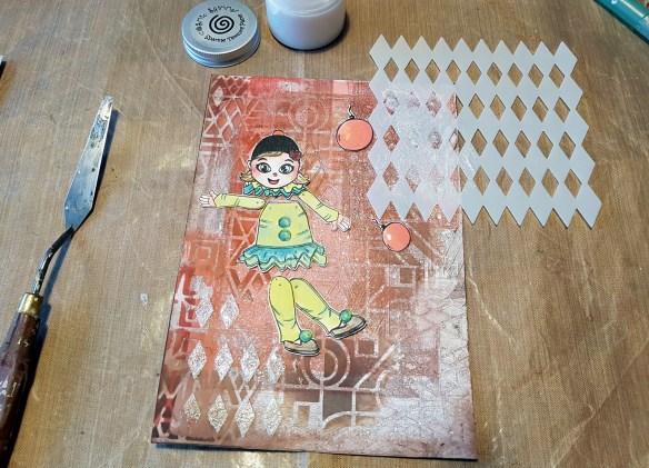 J’ai ensuite retiré le pochoir rectangle, puis placé le masque intérieur sur mon image, afin de la protéger à son tour des débordements de couleur, lorsque jai choisi de coloriser le petit cadre dans des teintes orangées. Cela m’a permis de le faire très vite, sans me poser de questions !