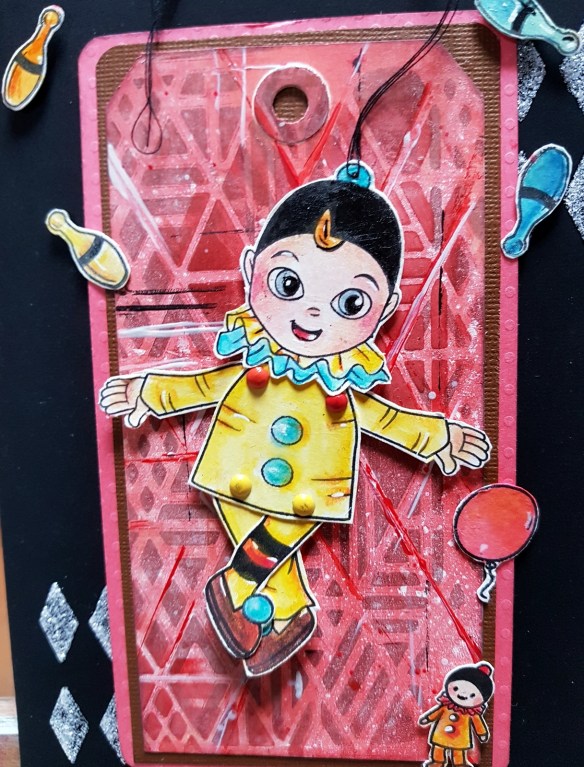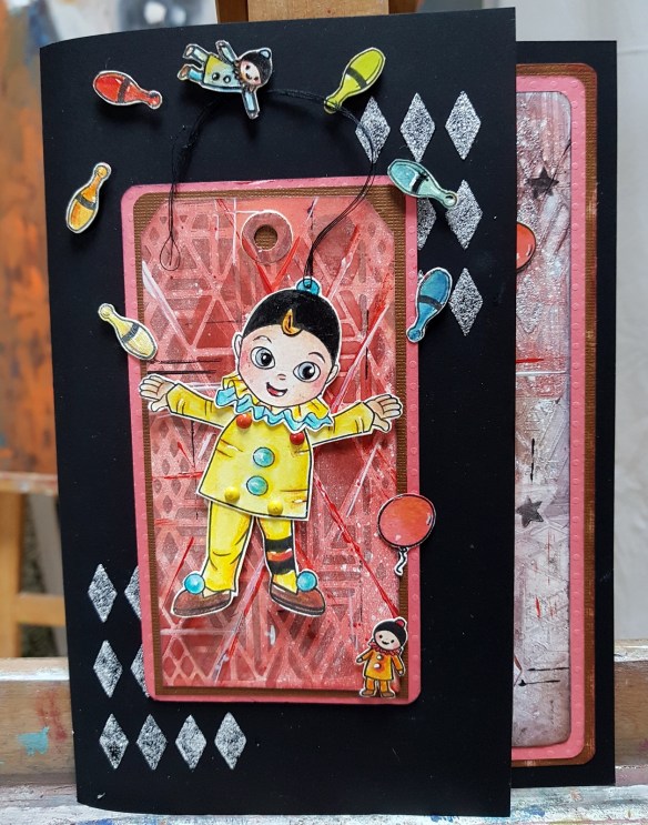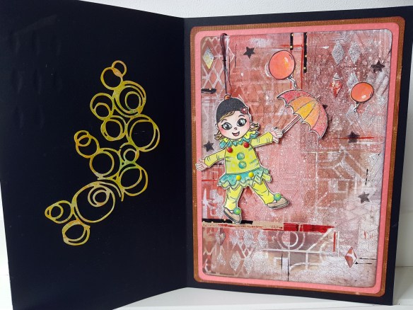 Voici ma carte achevée, après l’avoir matée sur différents papiers unis et collée sur du cardstock blanc :
