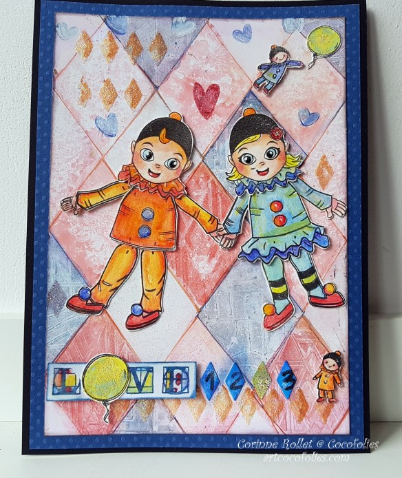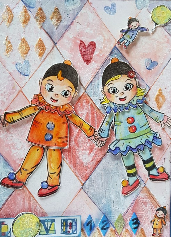 Pour cette seconde réalisation, j’ai choisi de représenter ensemble mes deux petits pierrots fille et garçon, amoureux l’un de l’autre…