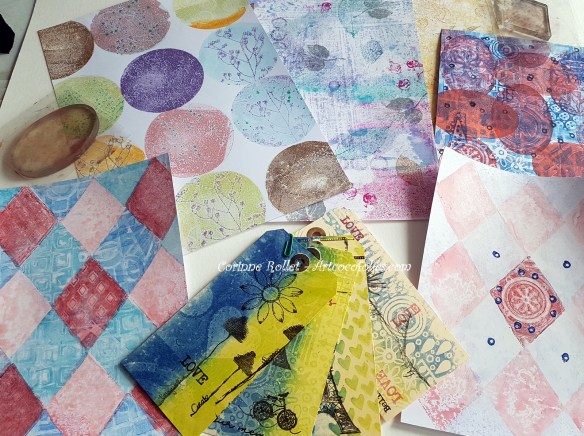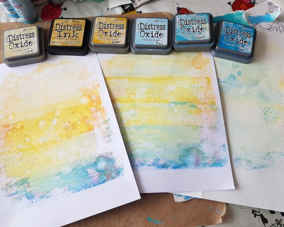 Mon point de départ pour cette carte a été trois fonds monoprints faits très rapidement en jouant avec quelques boîtiers d’encres Distress et Oxide, que j’ai retournés et appliqués en tirant des bandes sur ma grande Gel Printing plate. J’ai réduit les marques intermédiaires en passant légèrement mon rouleau brayer au niveau des intersections de couleur sur ma plaque, puis j’ai vaporisé un peu d’eau sur l’ensemble, et enfin j’ai imprimé rapidement un ou deux tampons de texture (ce sont les petits points que vous voyez en blanc ou en bleu sur ma photo).