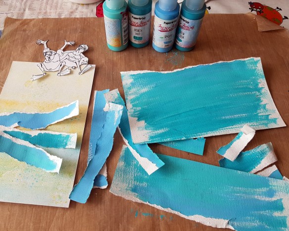 Puis je l’ai déchiré à la main en bandes irrégulières, en laissant un peu apparaître les bords blancs du papier, et j’ai placé et collé 4 bandes dans le bas de ma scène.