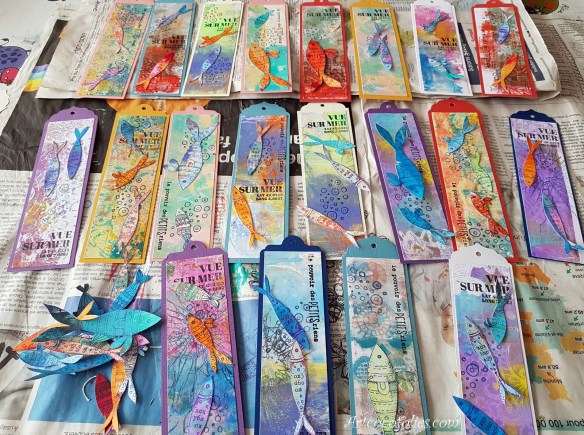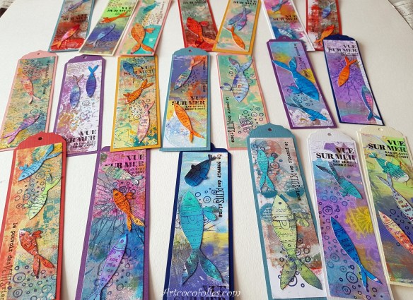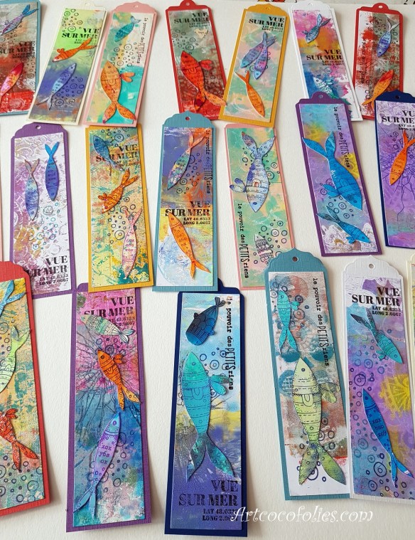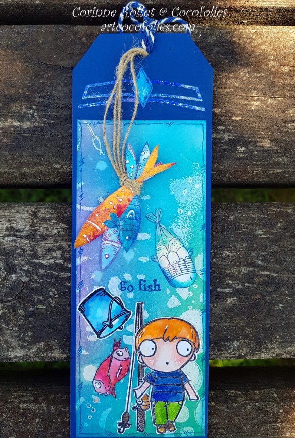 Je reviens aujourd’hui vous partager une carte et un marque-page, sur le thème des poissons multicolores, de la pêche et de la mer, un thème qui m’inspire bien en ce moment… sans doute une envie de vacances bien compréhensible !!!
