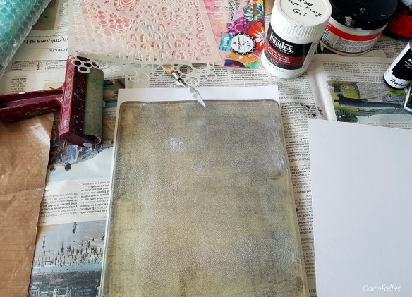 Pour faire mon fond, je me suis servie de ma Gel Printing Plate rectangulaire, d’encres Distress Oxide telle que la Fired Brick, et de Gel Medium que j’ai appliqué au rouleau brayer sur un pochoir posé au préalable sur ma plaque, suivant une technique démontrée par Birgit Koopsen, une référence en matière de fonds imprimés à la Gel plate ! N’hésitez pas à visionner ses vidéos sur le site de GelliArts si vous vous êtes équipé(e) en Gel plate + brayer, et voulez découvrir quelques techniques par vous-mêmes…