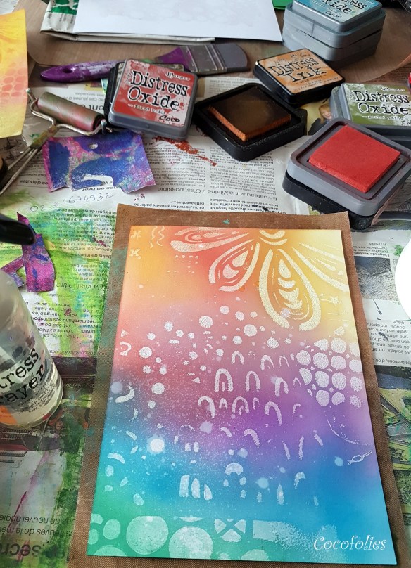 J’ai joué ensuite avec mes encres Distress en pad, en version classique ou oxide. Après application de mes couleurs sur mon papier, voici un premier fond de carte obtenu (vous en verrez d’autres prochainement, cette technique étant vite addictive ;-). Le gel medium permet un effet de « résist » très intéressant !!